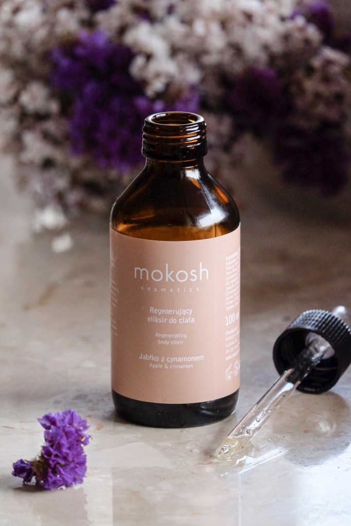 Kiedyś często używałam olejków do ciała – ostatnio odsunęłam je w kąt na rzecz szybko wchłaniających się balsamów. Regenerujący eliksir do ciała od Mokosh Cosmetics przypomniał mi jednak, za co lubiłam olejki. Eliksir o pięknym szarlotkowym zapachu jabłka z cynamonem udało mi się kupić na wyprzedaży zestawów prezentowych w Rossmannie – razem z nawilżącym balsamem do ciała o tym samym zapachu kosztowały ok. 50 zł, więc uznałam, że to świetna okazja wypróbować kosmetyki marki, o której już od dawna słyszę wiele dobrego.